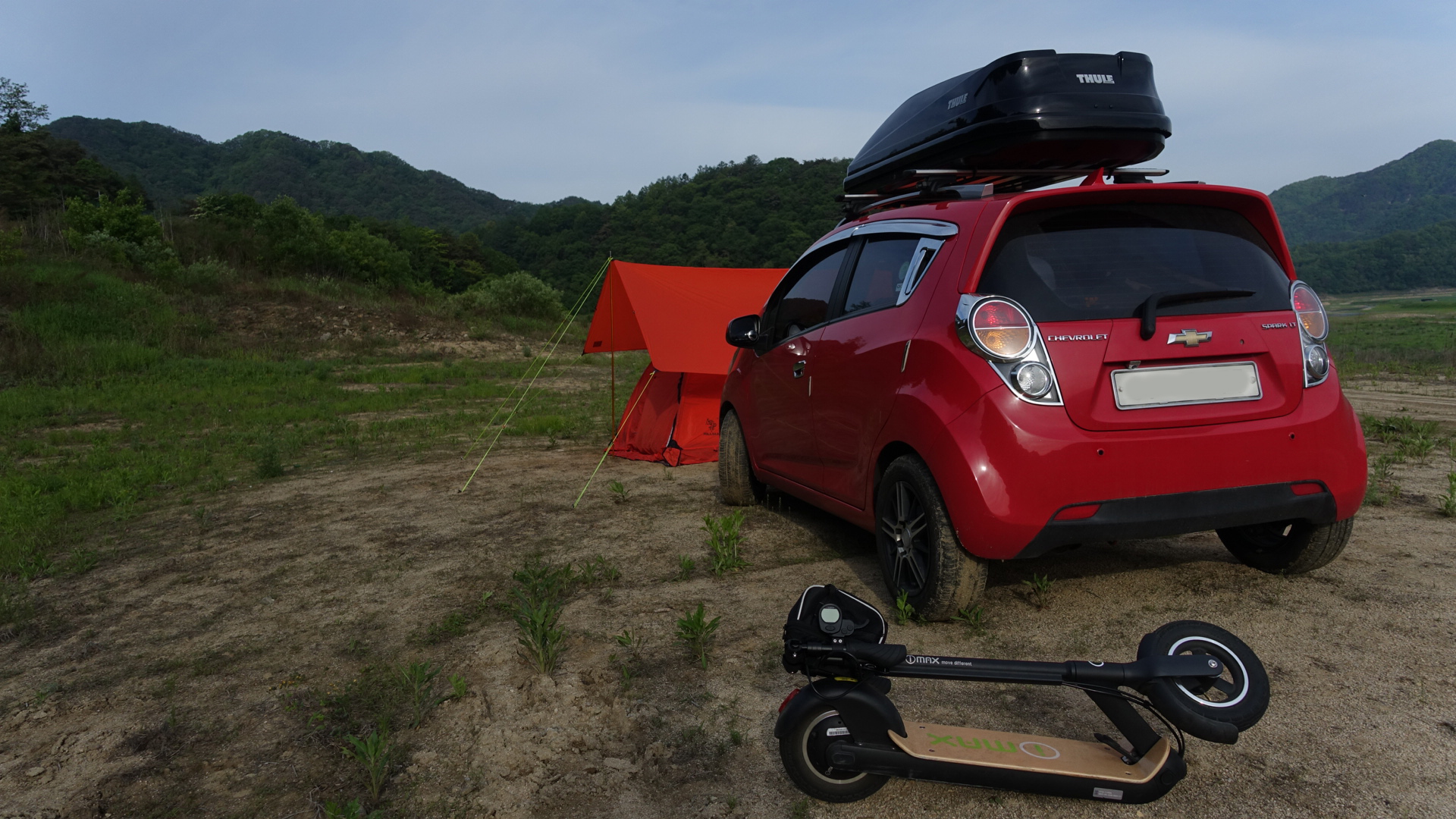 멍~~~ 하고 있으면 심심할 때도 있어서.. 캠핑 갈 때 이렇게 전동 킥보드를 가지고 다닐 때도 있어요~