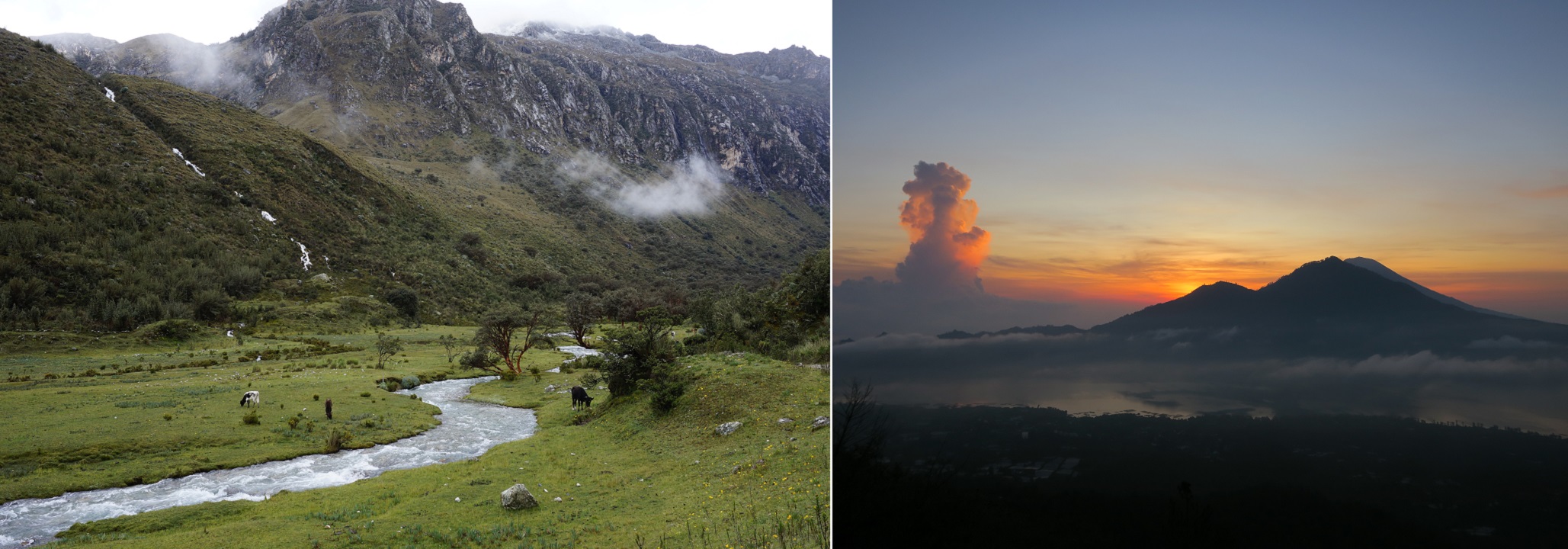사진 속 장소는 페루 69호수 보러 올라가는 길과 발리 바투르 화산입니다.