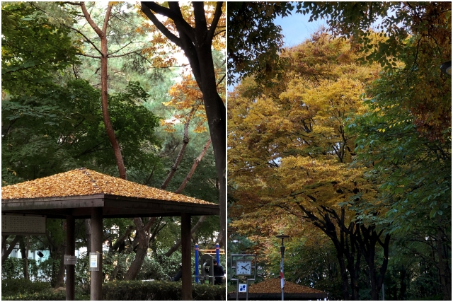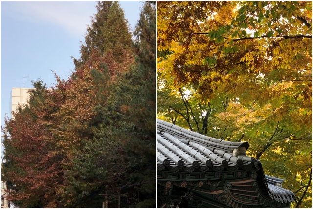 노랗게 빨갛게 알록달록 물든 단풍과 지붕 위에 쌓인 낙엽들이 지금은 가을의 하이라이트야! 라고 말해주고 있답니다 XD