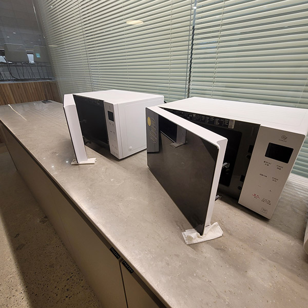 라운지에서 가장 많이 사용되고 있는 전자레인지도 매일 닦아주고 있어요!