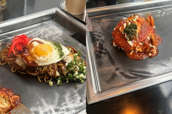 시그니처 메뉴인 토마토 베이스에 새우 토핑을 올린 오꼬노미야키와 클래식 야끼소바를 주문했어요
